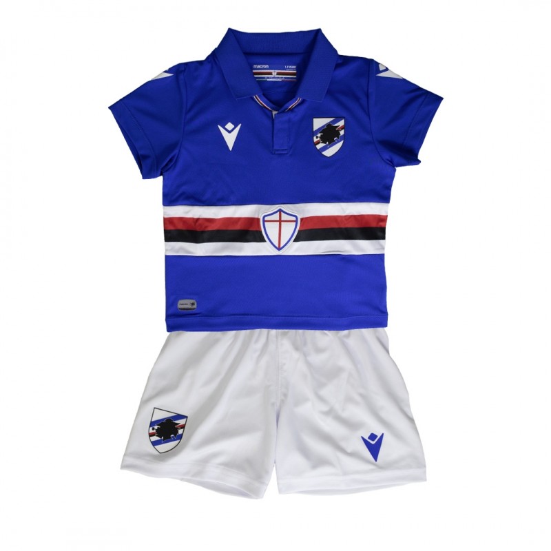 Kit home FC Bologna stagione 2019/2020 Modello per neonati Maglia rosso blu e BFC logo ricamato lato cuore Pantaloncino blu Prodotto ufficiale Macron