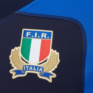 Maglia Allenamento Rugby Fir Italia. Realizzata da Macron in poliestere di colore blu sulle spalle e le maniche e la parte centrale della maglia è in blu royal. Loghi federazione italiana e sponsor applicati. Sul retro tono s tono la scritta ITALIA.